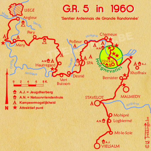 Het eerste G.R.-pad in België was zo ontworpen dat je onderweg kon overnachten in Natuurvriendenhuizen, jeugdherbergen en eventueel op een camping.