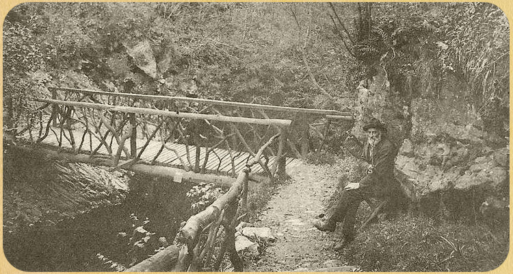 Emile de Damseaux, poserend rond 1905 op de nieuwe, naar hem genoemde wandelbrug ter hoogte van de 'Gouffre des Moutons'.