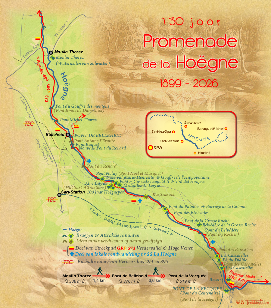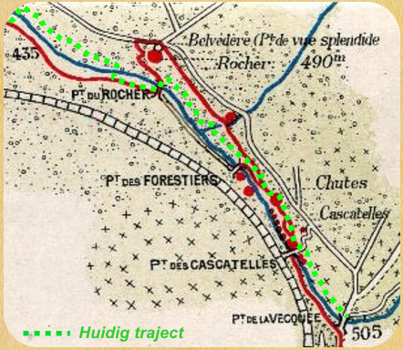 Uittreksel van de Promenade de la Hoëgne-kaart uit 1910, getekend door Jean-Louis Colinet uit Hockai. De rode lijn toont de wandelroute uit die tijd met de passage langs het uitzichtpunt. Toen bestonden nog de bruggen 'Pont des Forestiers' en 'Pont des Cascatelles', vandaag verdwenen. De ingetekende groene stippellijn toont het huidige traject dat grotendeels via de rechteroever van de Hoëgne loopt. De bruggen 'Pont du Palmier', 'Pont des Bénévoles' en 'Pont de la Grosse Roche' bestonden in 1910 nog niet. De 'Pont du Rocher' werd ook de 'Pont du Belvédère' genoemd. De 'Pont de la Vecquée' is sinds 1930 ook bekend als de 'Pont du Centenaire'. De grootste trajectwijzigingen vonden hier plaats tijdens de eerste jaren van de 21ste eeuw.