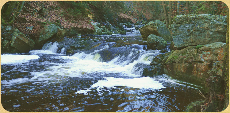We stijgen verder langs de linkeroever langs een Hoëgne die er niet minder mooi op wordt maar integendeel blijft borrelen, klotsen, watervallen en schuimtaarten produceren tussen de kwartsietrotsen door. Al even geleden dat we nog een langs een bruggetje kwamen. We bereiken de