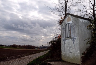 > Rechtdoor over kassei stijgen we naar de grens met Overijse. Hier lopen we over de verharde (!) 'Aardeweg' om bij het einde daarvan alweer Overijse te verlaten en Huldenberg in te wandelen over een brede, licht verharde veldweg. Bij een V-splitsing rechts volgen. Als de gewassen niet te hoog staan, zie je links een rustig gelegen Lourdeskapel in de velden.