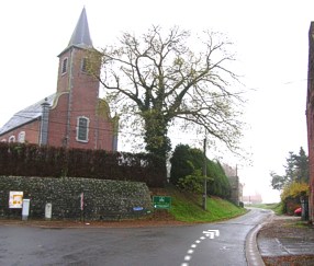 > Je kunt na dit uitstapje GR 121 terug oppikken door rechts de N69 over een paar honderden meter te volgen. Onze langeafstandsroute steekt dus de N69 over. Deze veldweg komt 900 meter verder bij een asfaltwegje in open veld. Links hier en nu de hele tijd rechtdoor tot in het centrum bij de kerk van Les Waleffes. In de omheiningsmuur van het kerkgebouw is een bronzen herdenkingsplaat voor Hubert Krains.