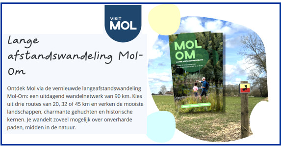 > Voor de vernieuwde padmarkering zocht VisitMol in 2024 wandelmeters en -peters. Hier en daar werd het routetraject ook op een paar punten bijgesteld. Met de publicatie van een papieren kaart en GPS-bestanden in oktober 2025, wordt het project voor een vernieuwde Mol Om van 90 km (met lussen van 20,32 en 45 km) weer verankerd en afgerond. Wedergeboorte van Mol-Om in versie 3.0 !