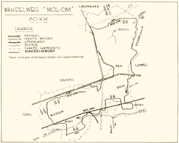 > Eind 1972 wordt een eerste deel ingewandeld. Dat ging vlot maar dat bleef niet zo. Het uitzetten de routemarkeringen verloopt niet zonder problemen, met name op het noordelijke deel. Boswachters en terreineigenaars of -pachters stonden in die tijd vaak weigerachtig tegen bewegwijzeringstekens. Er moest op het noordelijke deel worden uitgeweken naar de grensweg of zelfs naar Nederlands grondgebied, waar de boswachter inschikkelijker was. Het verklaart wellicht ook waarom het traject van Mol-Om vele jaren niet langs de abdij van Postel liep. Aimé Wouters: "Vanaf de Eerselse Weg tot de Reuselse Weg werd het een echte nachtmerrie, zodat regelmatig de moed bijna werd opgegeven ooit een pad rond Mol te kunnen uitzetten. Regelmatig bedreigd en verjaagd, gelukte het tenslotte toch de verbinding te maken, alhoewel de boswachters met de moed der wanhoop hun zogezegd wegenmonopolie en de jagers hun klopjachtenpaadjes verdedigden.(...) Er bleven echter nog wel plaatselijk wat moeilijkheden, oa met boswachters die probeerden wandelaars van openbare (!) wegenissen te houden met poortjes..."