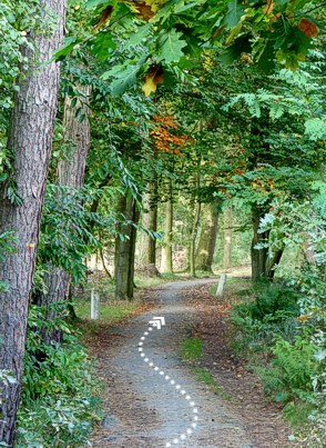 > De brede en met grind verharde bosweg kruist de verkeersweg Diel. Aan de overkant voert een graspad ons verder in het spoor van de Santiagoroute Via Monastica. 230 meter verder kiezen we voor een pad naar links. Dat eindigt na nog eens 230 meter op een T-kruising, waar we rechts gaan. Dit pad eindigt weer op een T-kruising, waar we dit keer links gaan.