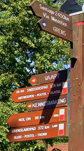 > De volgende kilometers kruisen we enkele wandelroutes van het GR-type. Geen probleem met het Nederlandse Grenslandpad, dat is witrood bewegwijzerd maar op de grens lopen we ook even samen met het Nederlandse Streekpad 'Brabants Vennenpad' en daarvoor zijn net zoals bij Mol-Om geelrode kleuren gebruikt!