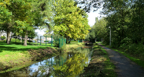 > Zoek nu weer het traject van Mol-Om op: met aanblik richting oude gemeentehuis ga je schuinrechts, naast het kerkgebouw om naast restaurant 'Onder den Toren' rechts een wandelpad op te pikken tot bij de Wandelweg langs de Molse Nete waar je weer over Mol-Om naar links kunt vervolgen. Die Molse Nete is de belangrijkste zijrivier van de Grote Nete. Hier in het centrum van Mol is het eerder nog een beek dan een rivier.