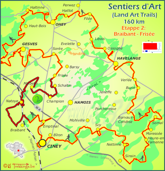 > Het wandelpad loopt door het kunstwerk rechtuit een pad op tussen prikkeldraad. Links tot op een straat van Natoye. Rechts, eerste links, Rue des Alouettes. Dadelijk een buurtpad rechts naar een kruispunt (superette Supra, apotheek, sporthal). We maken hier een rondje. Rechts, verderop links en nogmaals links (zicht op de kerk van Natoye). Daarna weer rechts, verder over de Rue Bellevue, na 300 meter rechts (Rue des Comognes). Deze steenslagweg daalt naar een V-splitsing. Linksvoor verder over het graspad naar het oud centrum van Natoye.