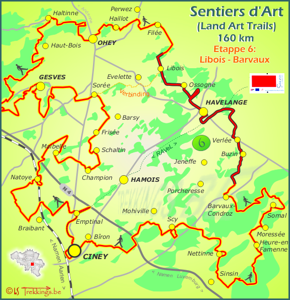> Verder op de hoofdroute van Les Sentiers d'Art. Vanaf de kerk van Libois gaat het traject stevig stijgen over asfalt (Rue Le Long du Château). Bij een loden zon valt dat niet zo mee, dat wordt zwoegen met de rugzak dus langs de rand van het kasteeldomein van Libois. Een eind hogerop gaan we schuinlinks over een steenslagweg. Die loopt door het Bois de Clavia Grimont. Aan de rand van het bos wordt de weg weer geasfalteerd, we dalen nu richting Ossogne, met aan onze rechterzijde wijdse zichten over de Condroz.