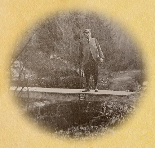 Emile de Damseaux, poserend rond 1905 op de nieuwe, naar hem genoemde wandelbrug ter hoogte van de 'Gouffre des Moutons'.