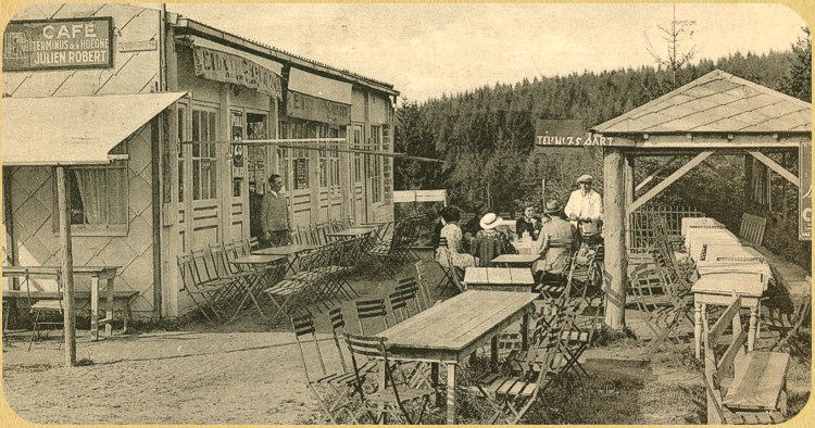 Opvallend merkpunt langs de Promenade de la Hoëgne was een eeuwenoude eik, de 'Chêne Rustique'. Sommige toeristen vonden het leuk om de boom, die in de eindfase van zijn leven was, op te klimmen. De eik stierf af half 20ste eeuw.(Foto Monfort - coll Musées de Verviers)