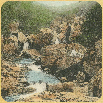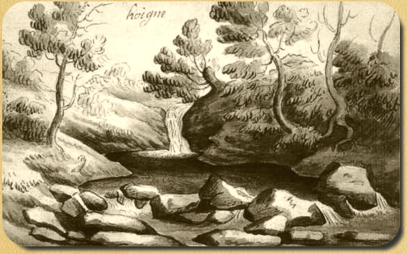 “Deze reis is heel gemakkelijk te maken, tot aan Hoquai, met een koets of te paard, via een van beide wegen. Koetsen en paarden kunnen nauwelijks verder komen; men moet dus te voet gaan en de rechteroever van de beek volgen, de moerassen vermijdend (….). Men komt hier prachtige watervallen tegen die elkaar op ongeveer een halve mijl afstand opvolgen en die met een vreselijk gedreun in het oor van de reiziger weergalmen, vooral tijdens het hoogwaterseizoen. In dit gebied kan men, zonder verder af te dalen, ook een grote hoop losse rotsen zien (wit dooraderde blauwe kwarts) van enorme omvang; en men ziet op verschillende ervan tamelijk diepe, ronde gaten, uitgehold door ronddraaiende stenen die daar vaak zijn achtergebleven. Deze kloof wordt versmald door bebost en tamelijk hoog gebergte. Uitstekende forellen zijn er in overvloed in deze beek, maar ze zijn moeilijk te vangen vanwege de vele ontoegankelijke schuilplekken die ze er vinden...”