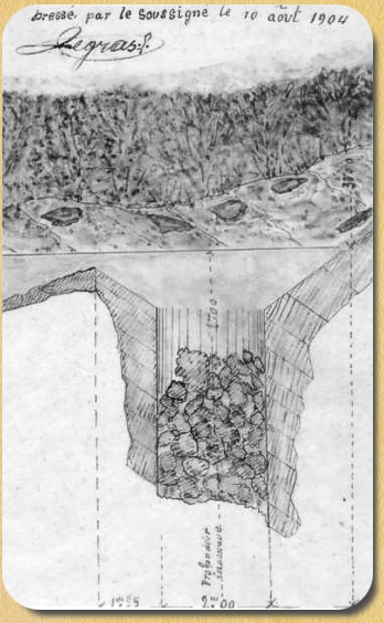 Léon Legras tekende een doorsnede van wat ze hadden kunnen vast stellen. Daaruit deze kaartuitsnede. De meetbare diepte van de poel die 2 meter diameter heeft, werd geschat op 2 meter water + 2,5 meter vulling met rotsen en rolstenen. Totaal gemeten diepte: 4,5 meter dus. (Bron Histoire et archéologie Spadoise - Michel Carmanne)