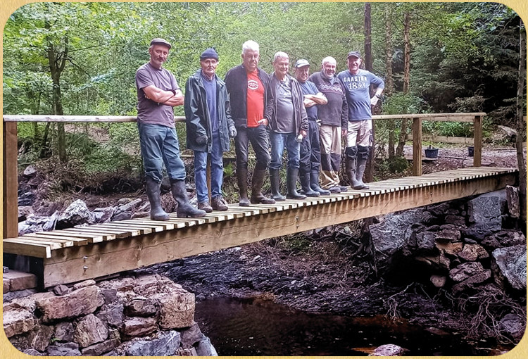 Enkele Maandagvrijwilligers bij alweer een nieuw afgewerkte (en verhoogde) wandelbrug. (Beeld Sart Tourisme)