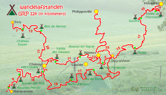 campings als aanvulling op de bivakplekken. Er zijn er te Chimay, Matagne-la-Petite, Vodelée en Olloy-sur-Viroin.